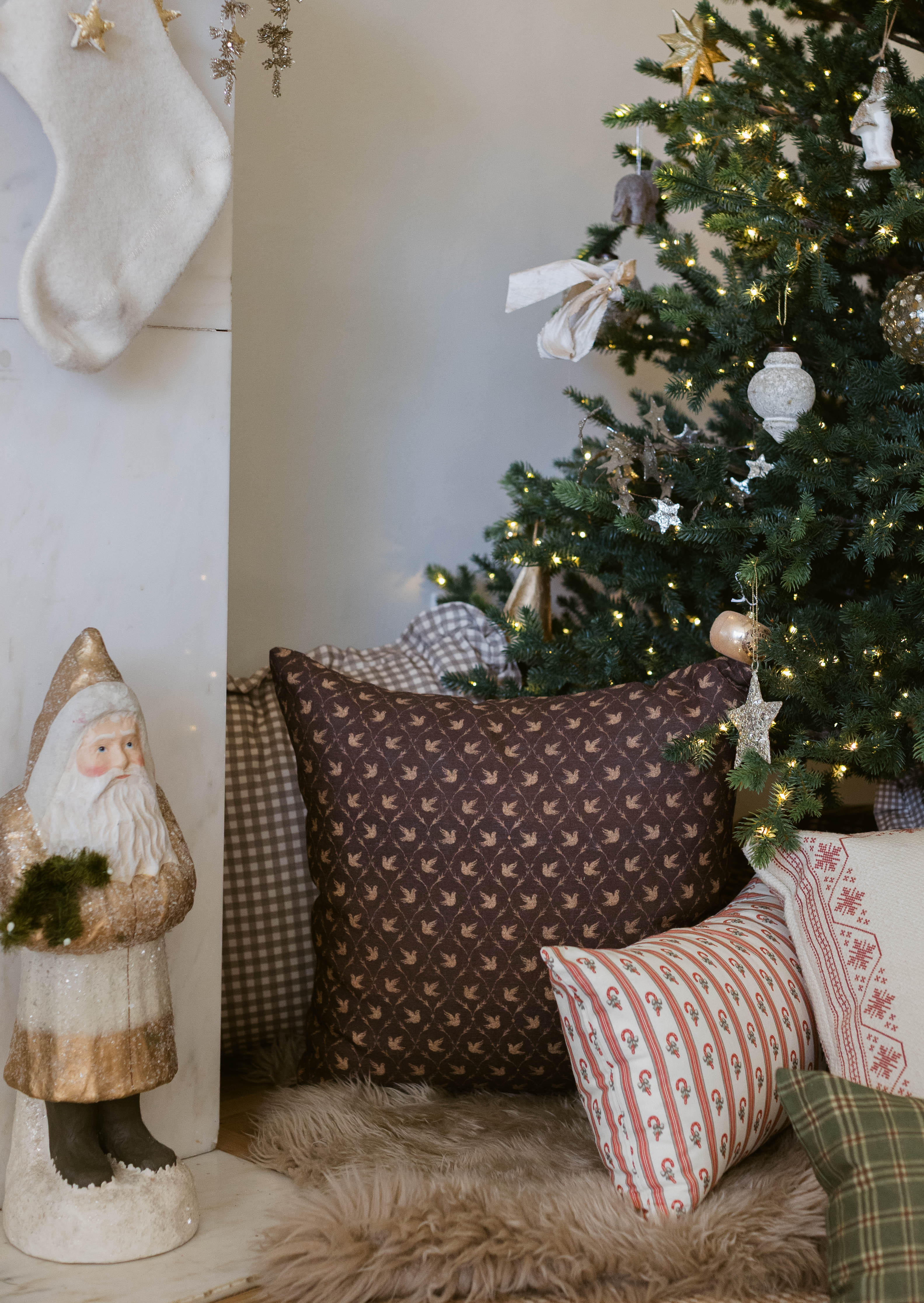 A warm burgundy base patterned with delicate golden doves — timeless, inviting, and perfect for layering through the holiday season and beyond.