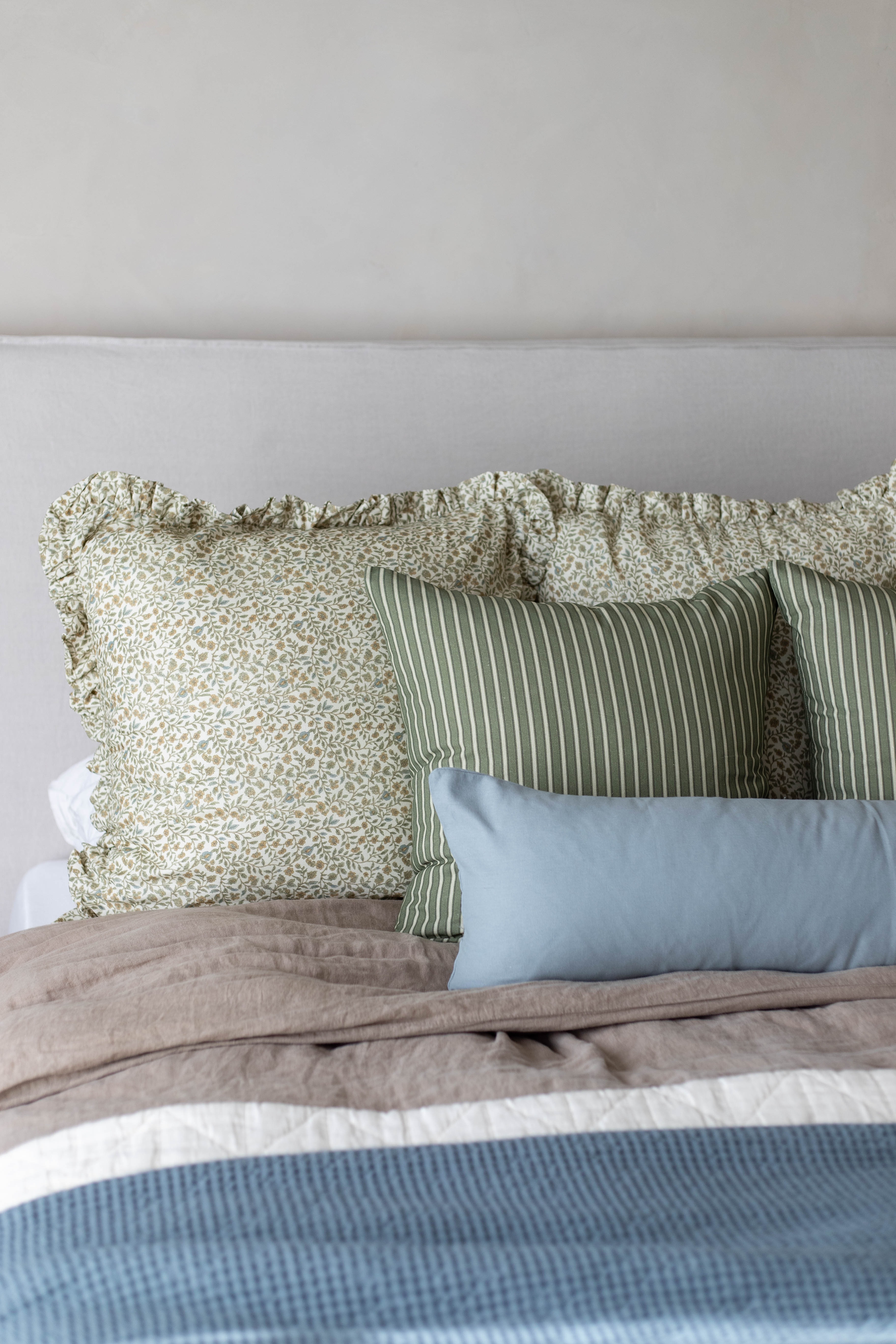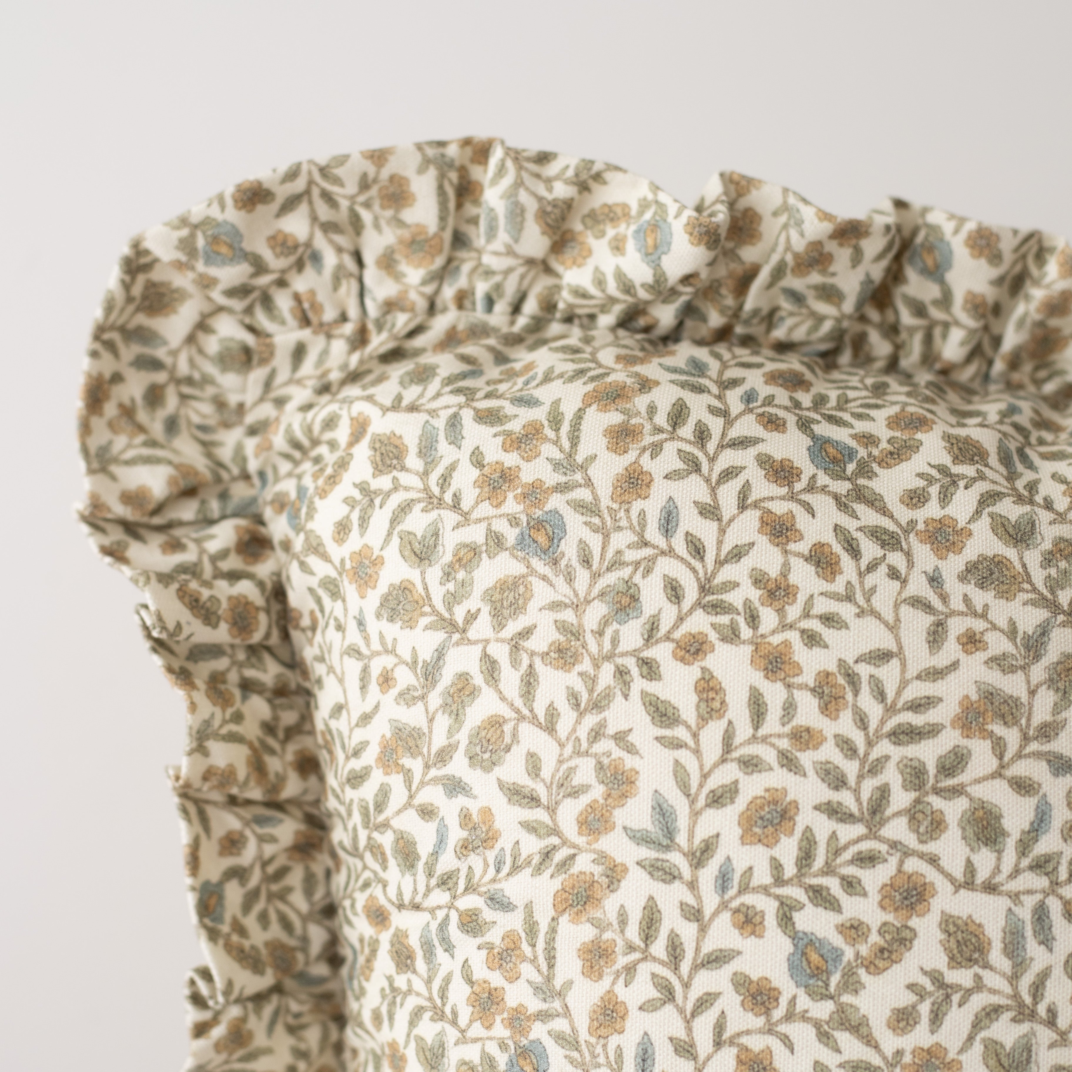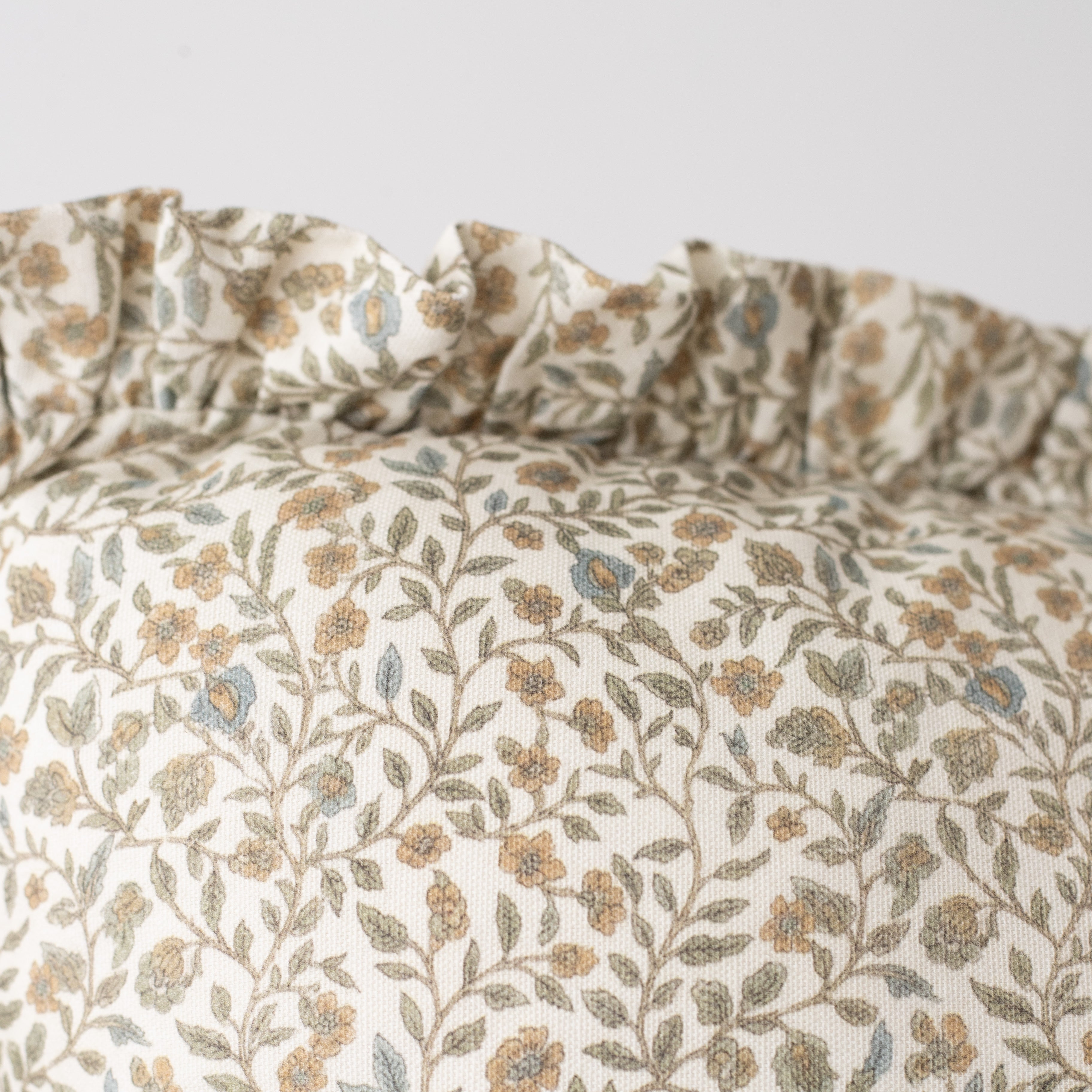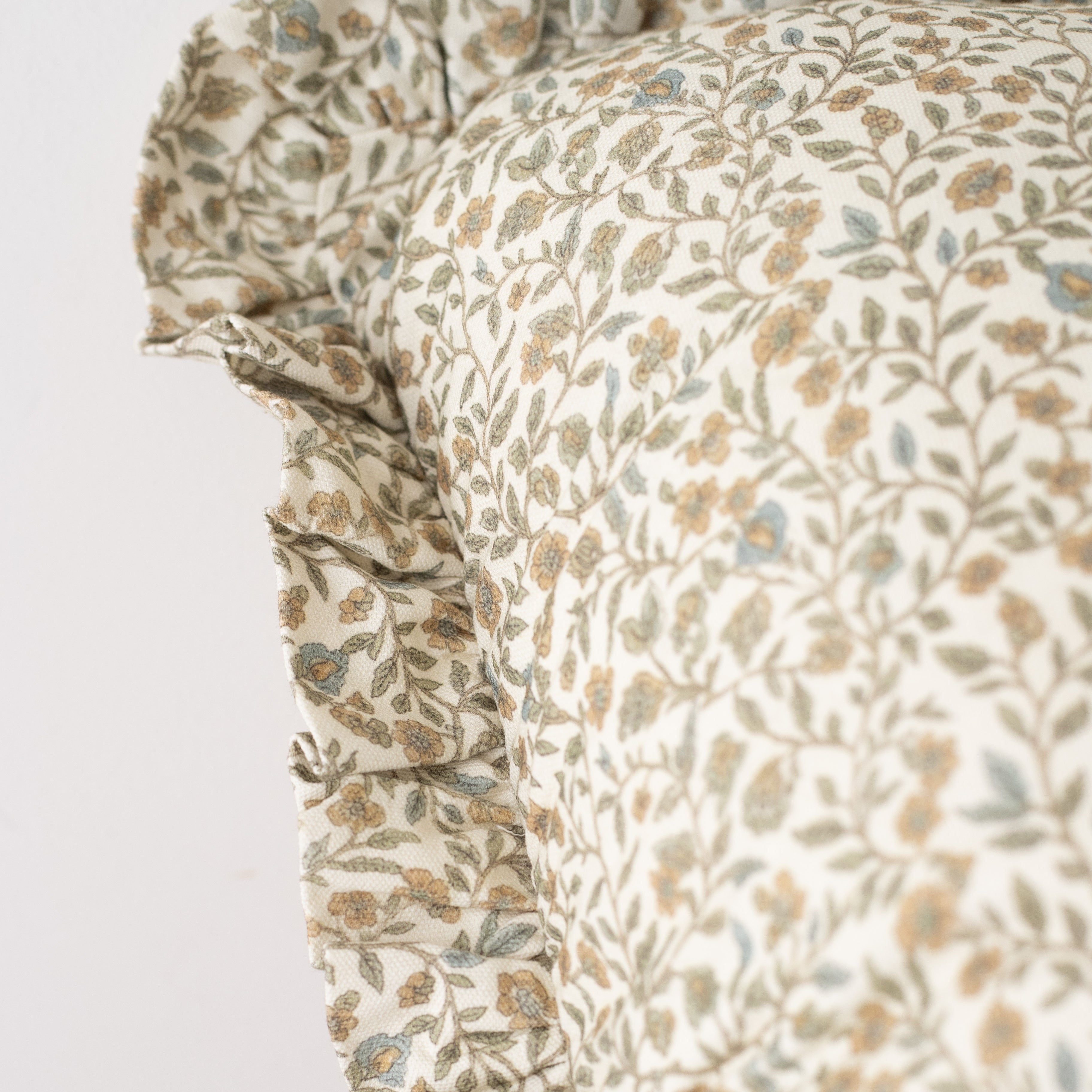 The Meadow Ruffle Pillow pairs a delicate, vintage-inspired floral with a soft ruffled edge, bringing an airy, cottage-garden feel to your sofa, bed, or reading nook. Its warm cream base and soft touches of sage, blue, and golden floral tones feel fresh and inviting—perfect for spring layering. Style it with light stripes, ginghams, and crisp neutrals for a space that feels collected, bright, and effortlessly lived in.