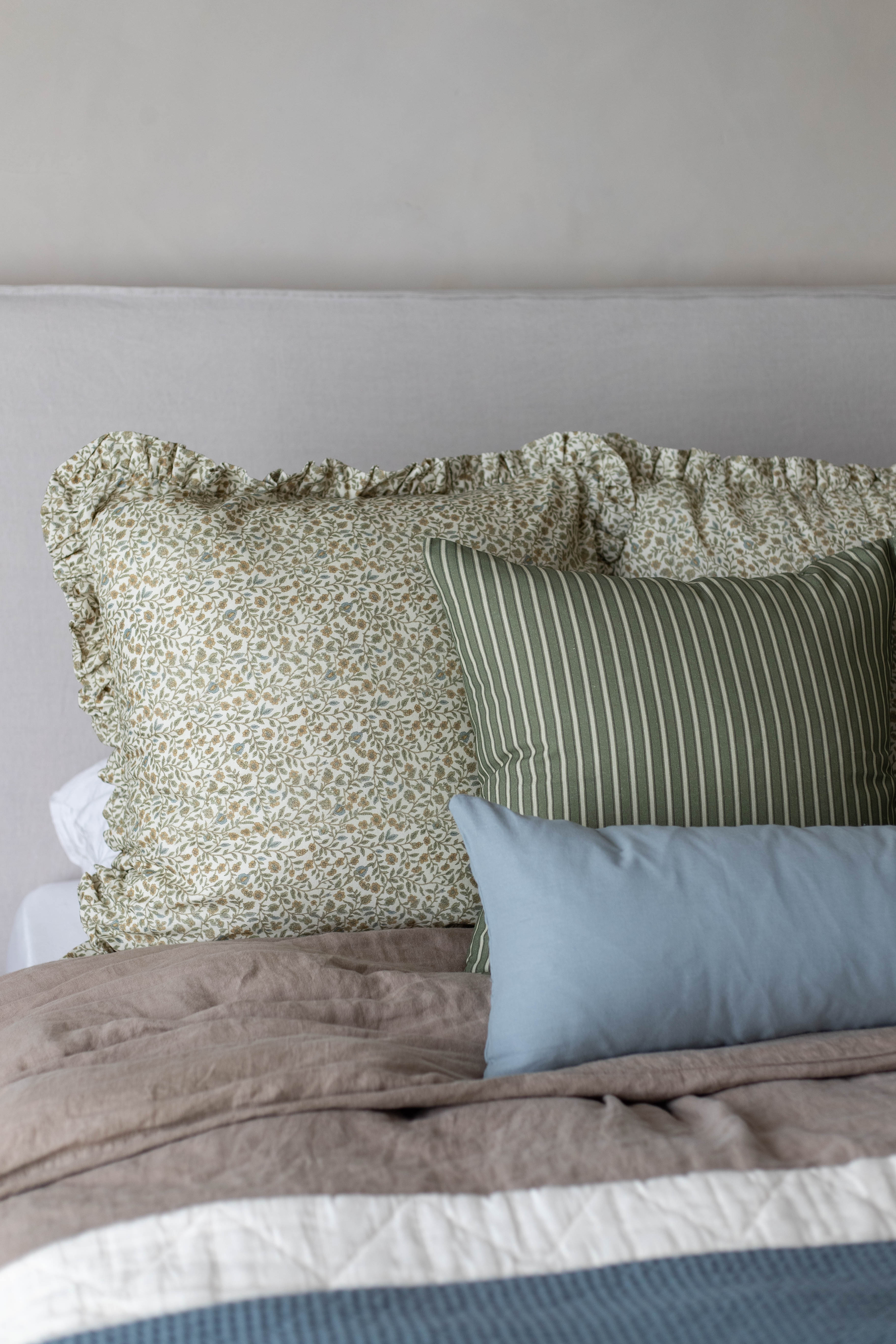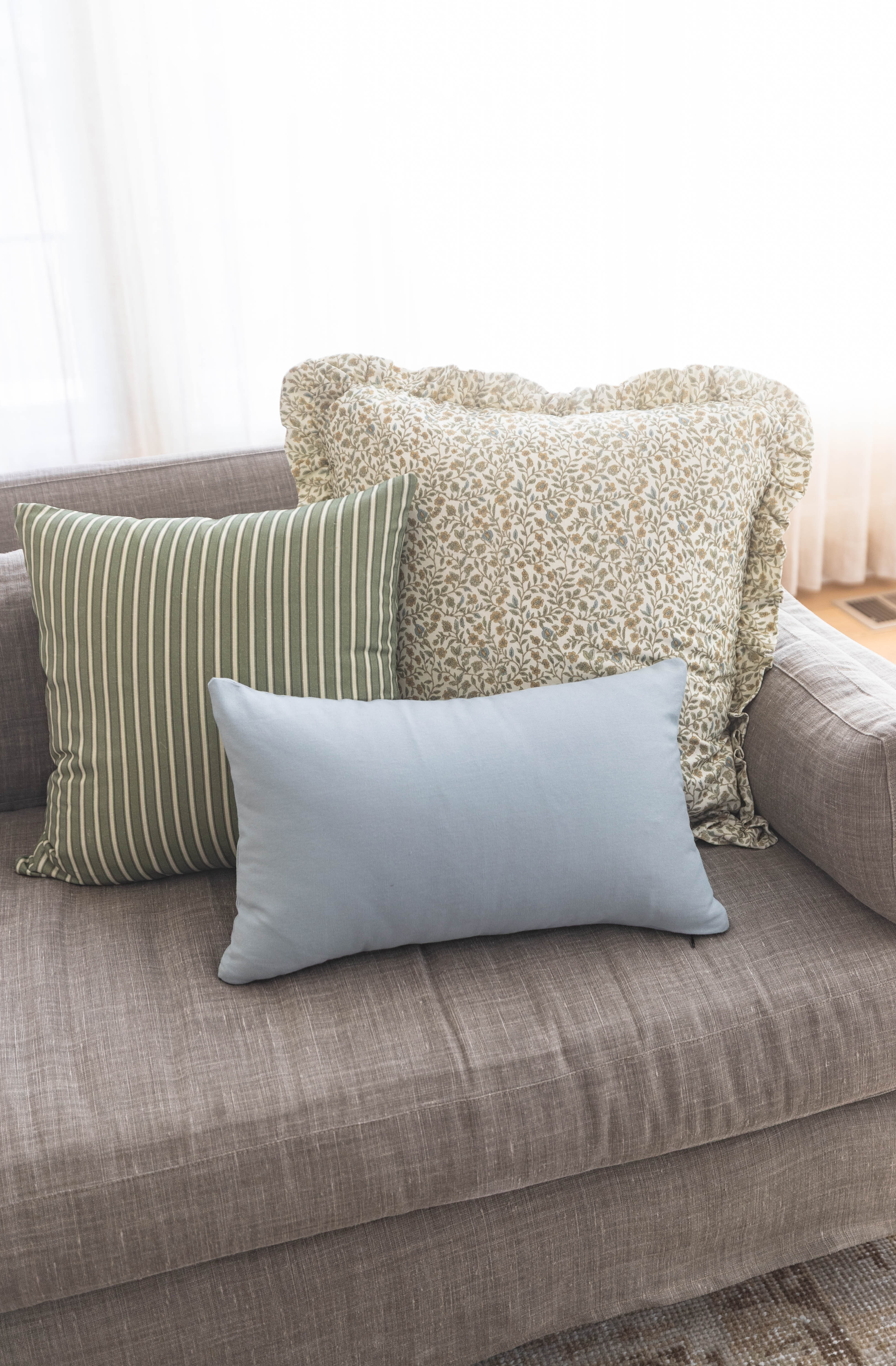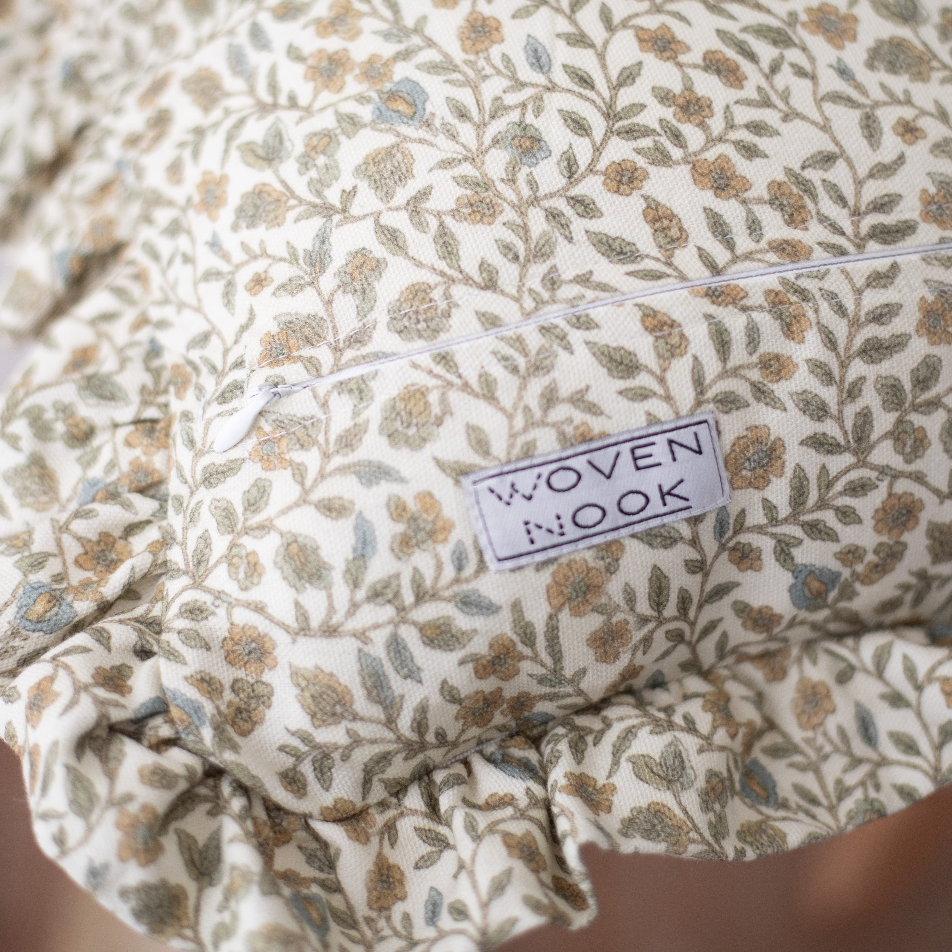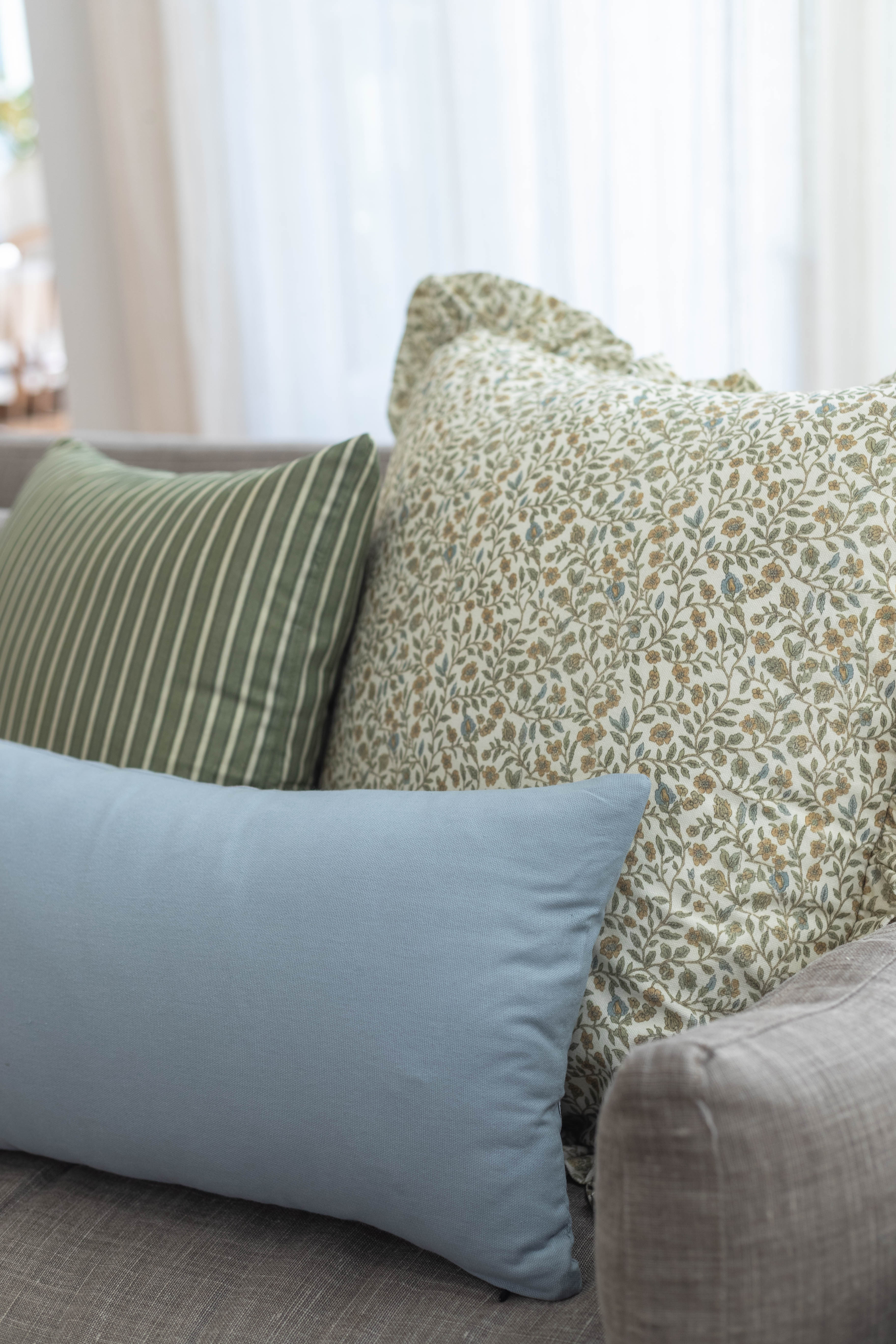The Meadow Ruffle Pillow pairs a delicate, vintage-inspired floral with a soft ruffled edge, bringing an airy, cottage-garden feel to your sofa, bed, or reading nook. Its warm cream base and soft touches of sage, blue, and golden floral tones feel fresh and inviting—perfect for spring layering. Style it with light stripes, ginghams, and crisp neutrals for a space that feels collected, bright, and effortlessly lived in.