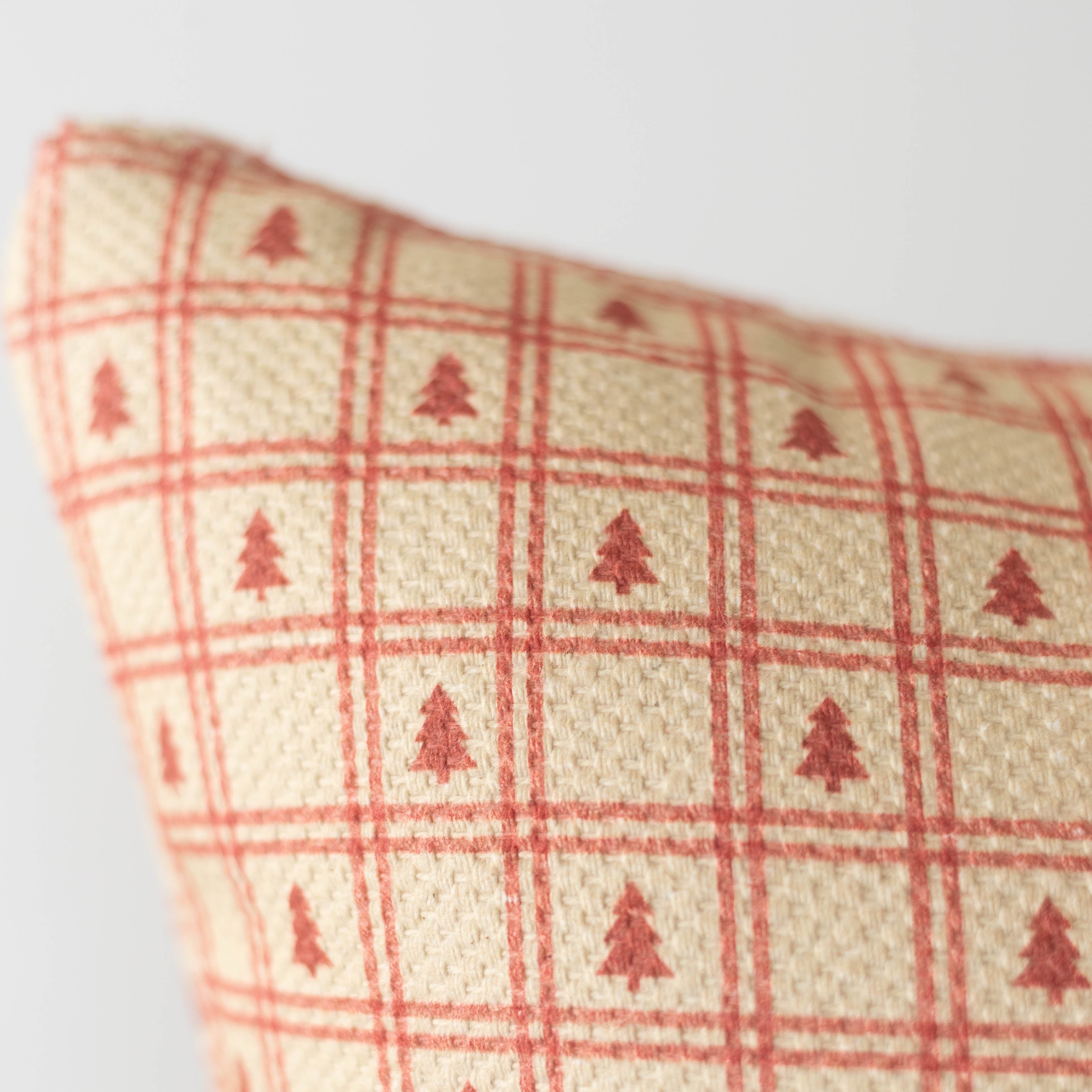 - Design: warm cream base with red trees and stripes