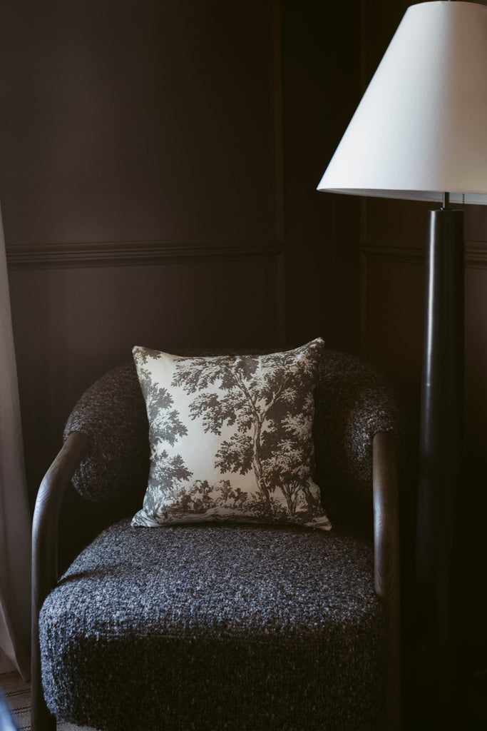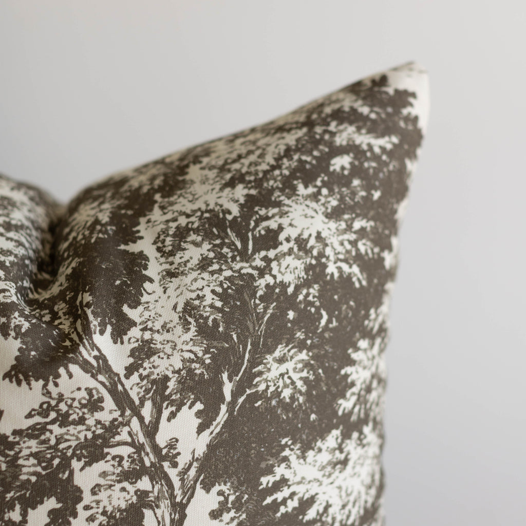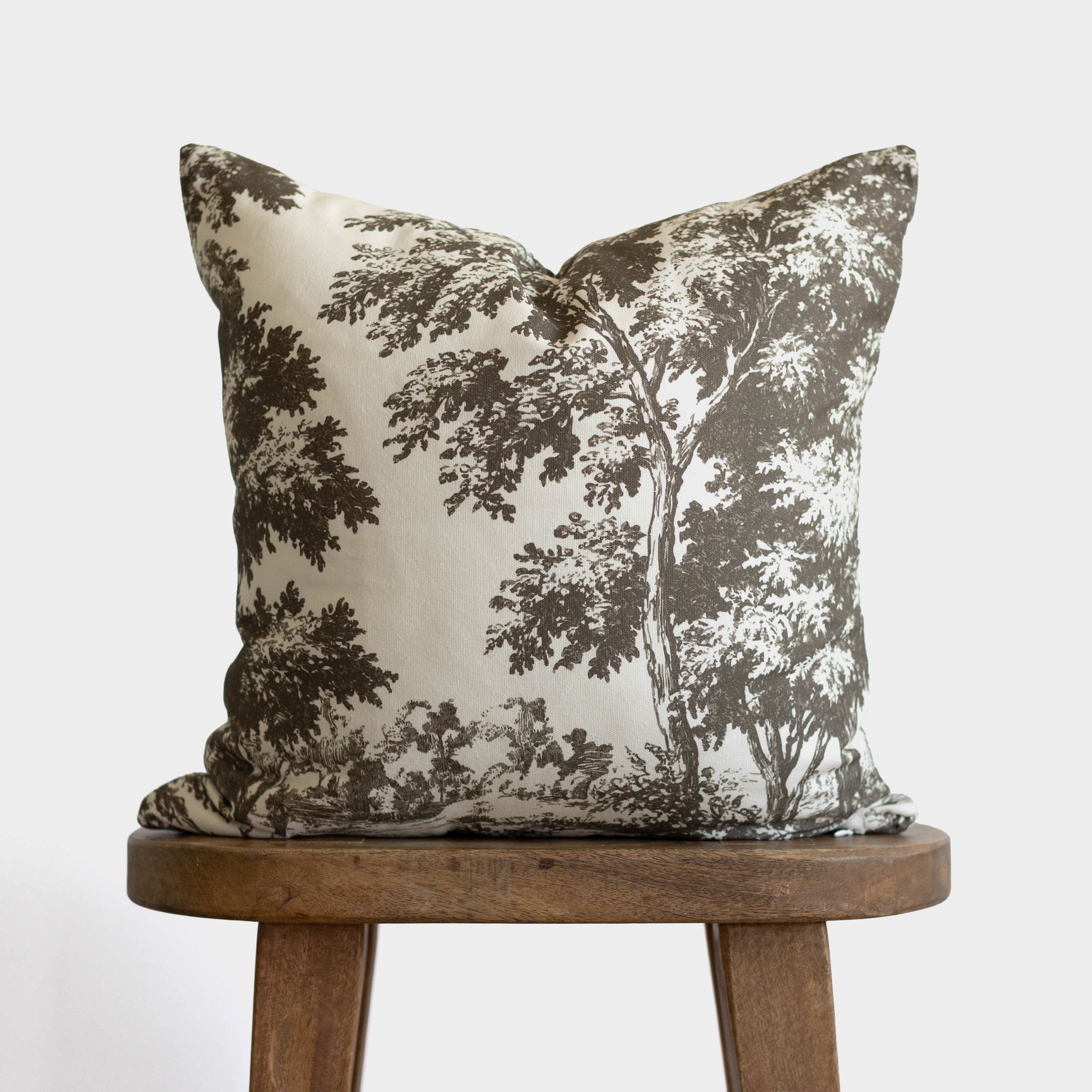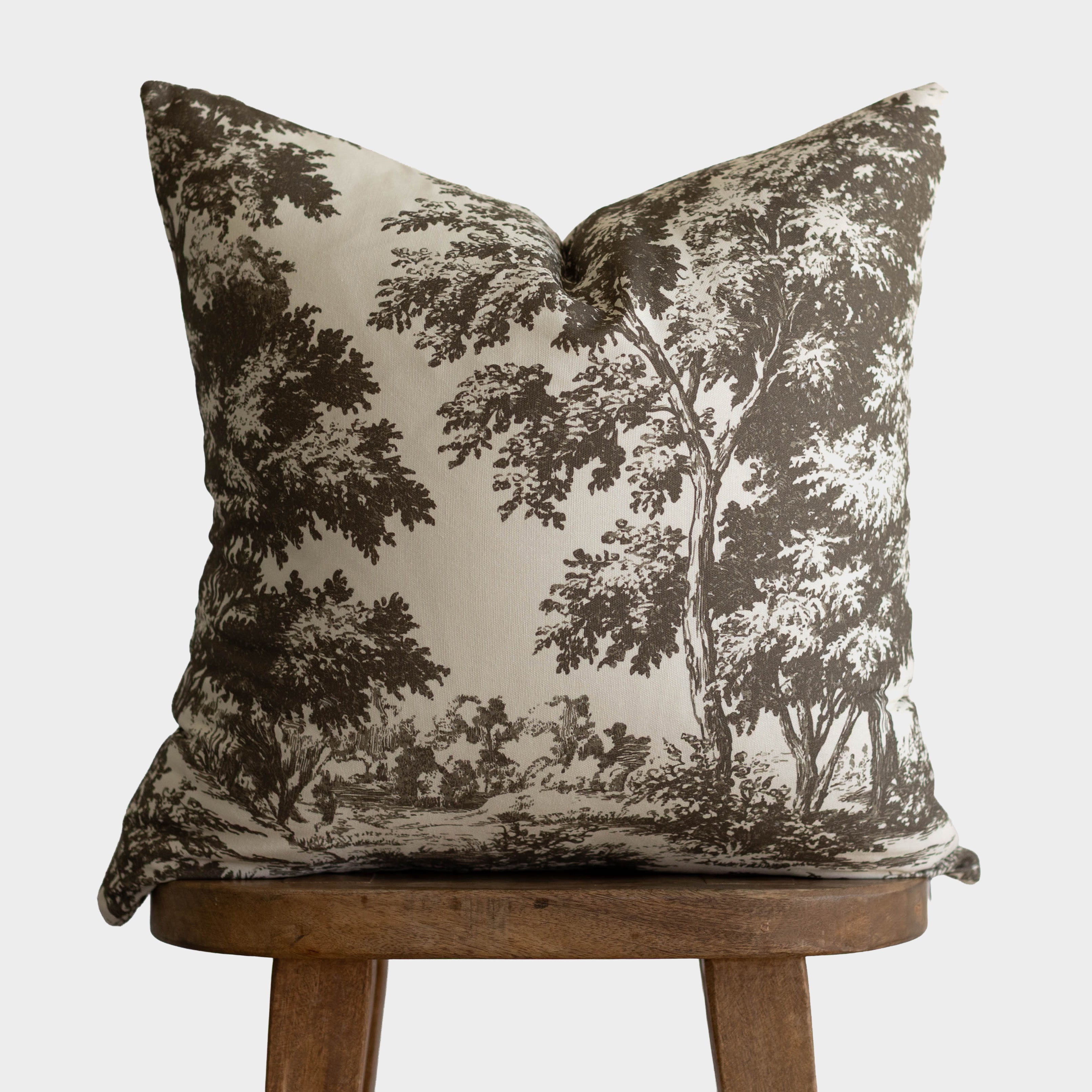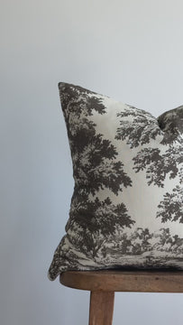 This pillow features a classic black-and-cream toile design, bringing timeless elegance and a touch of vintage charm to any space.