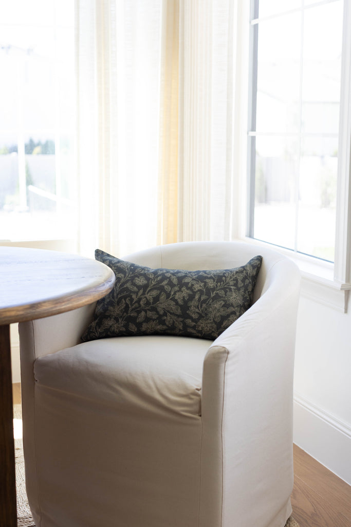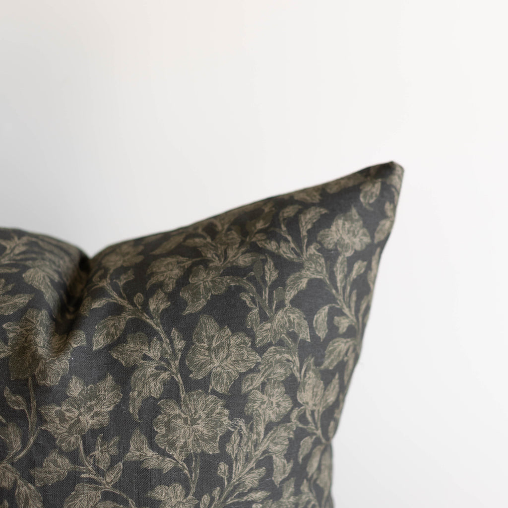 Edie features an intricate botanical pattern in muted tones against a deep, moody backdrop, bringing an elegant touch of drama to your seasonal styling.