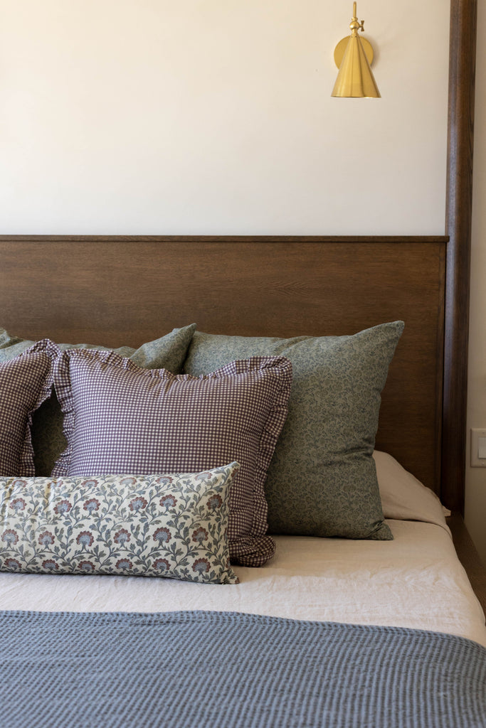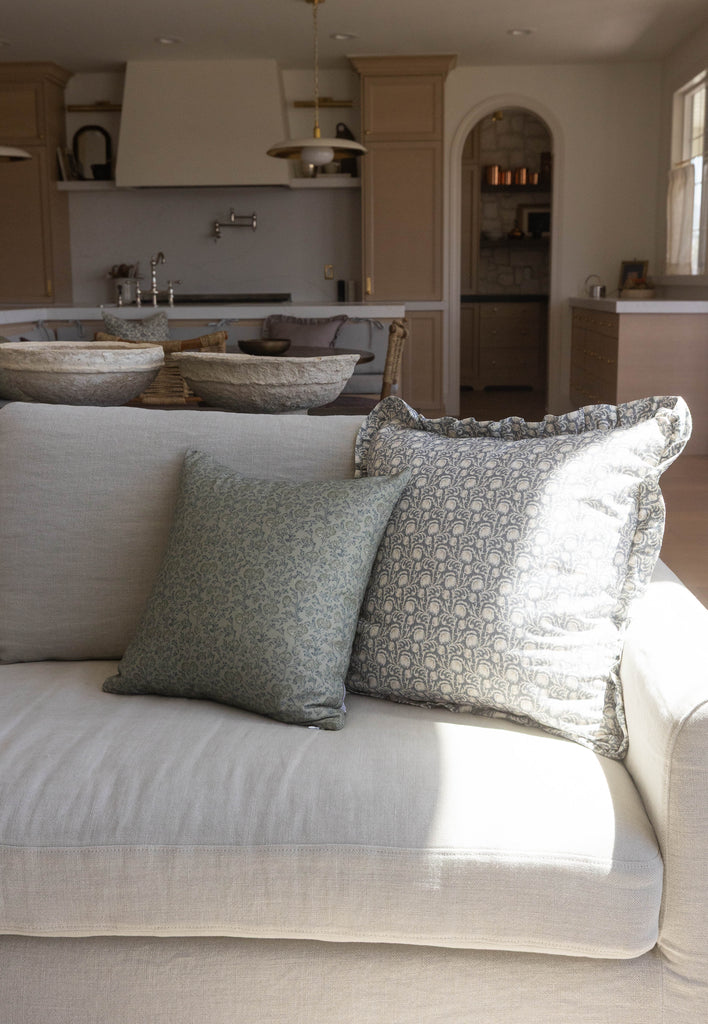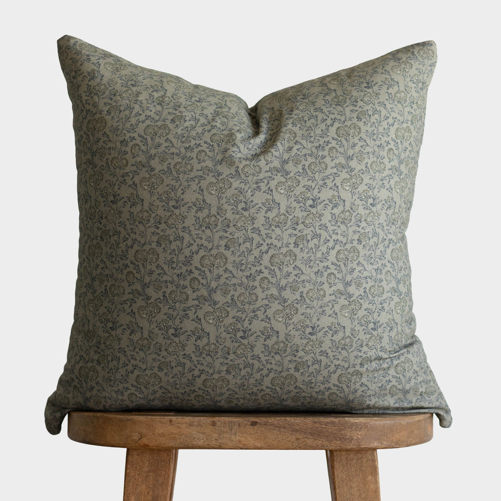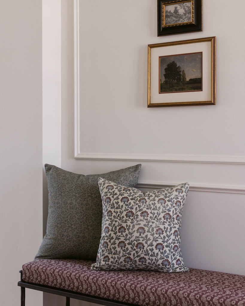 Leighton in green features a delicate floral pattern in a soft slate-blue green hue, perfect for adding a gentle layer of pattern to your home. Its versatile design works beautifully on a sofa, bed, or bench, pairing effortlessly with both solids and other prints for a collected, cozy look.