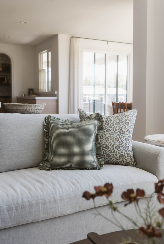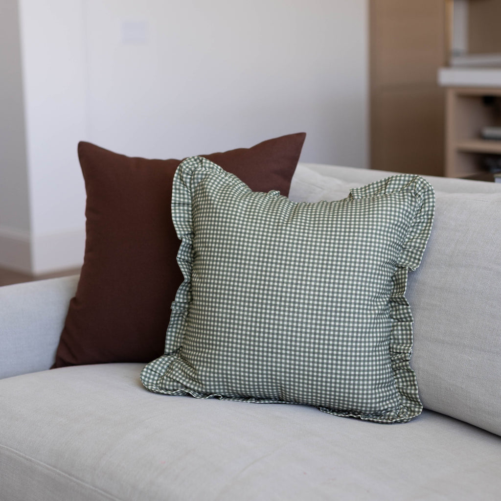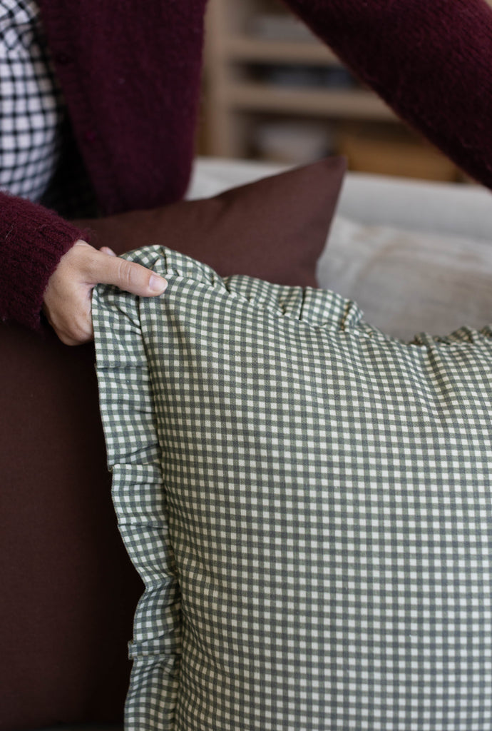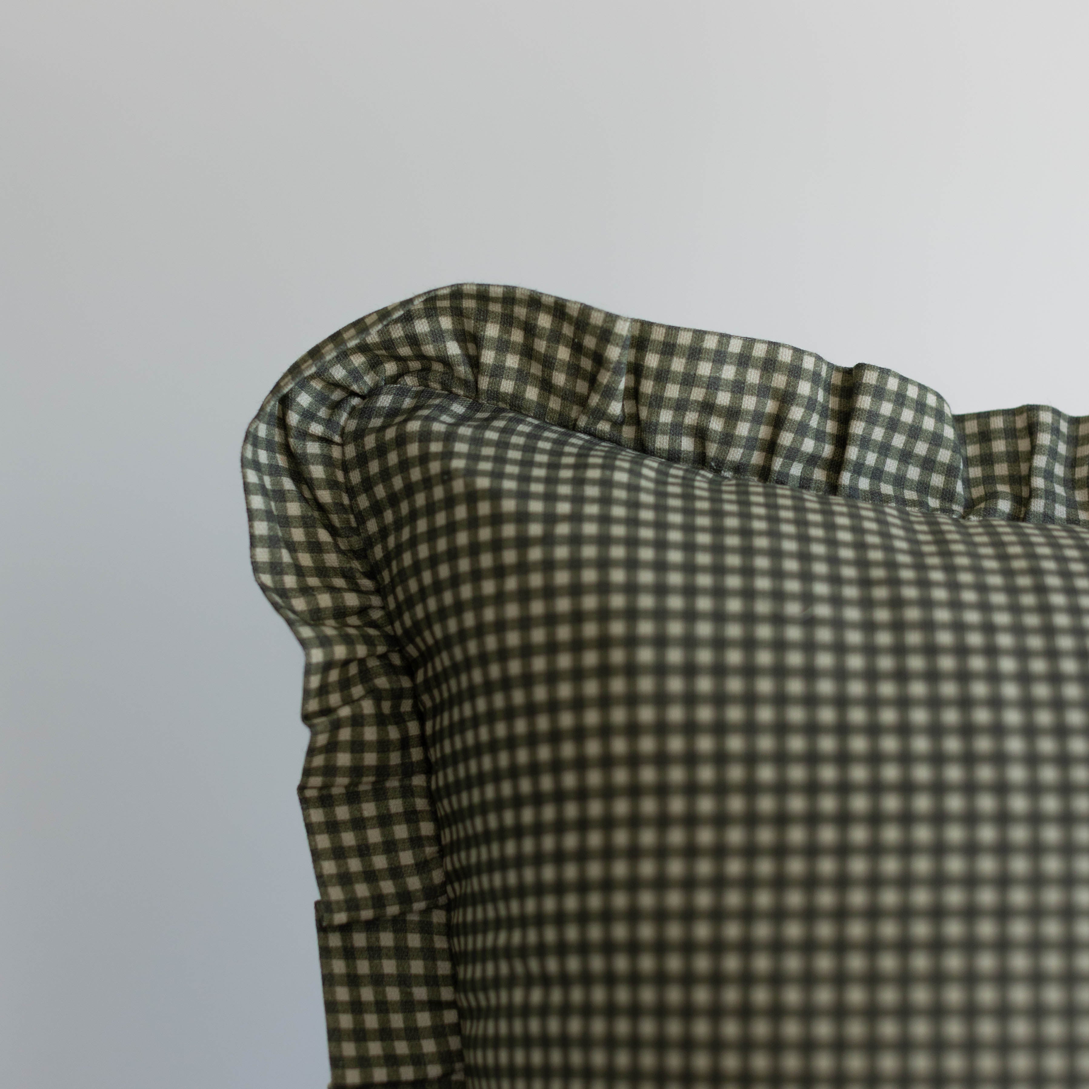 The green mini gingham ruffle brings a cozy, timeless feel with its classic green check pattern and soft ruffled edge. Perfect for layering with florals, stripes, or solids, it adds an inviting cottage-inspired touch to your sofa, bed, or favorite chair.