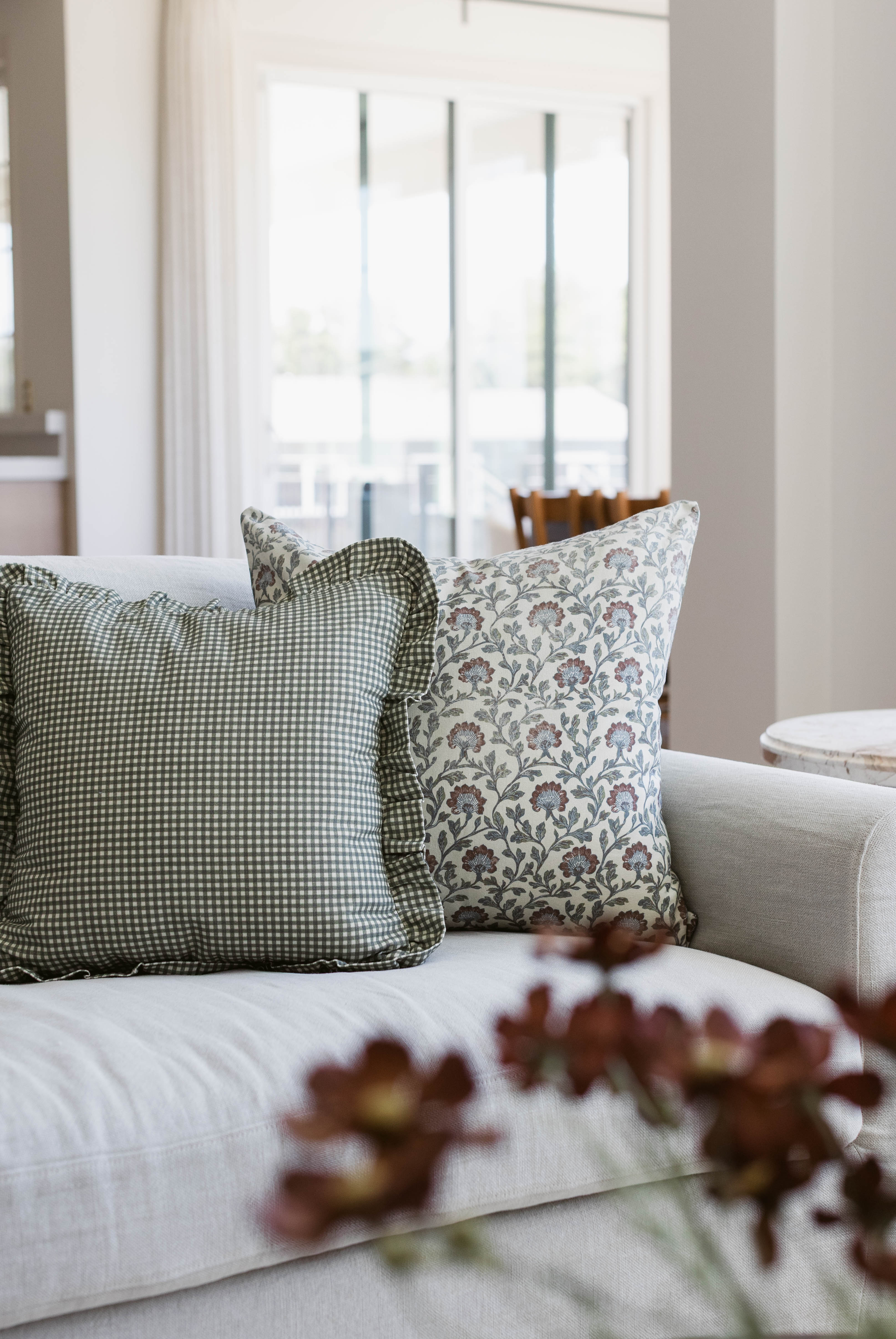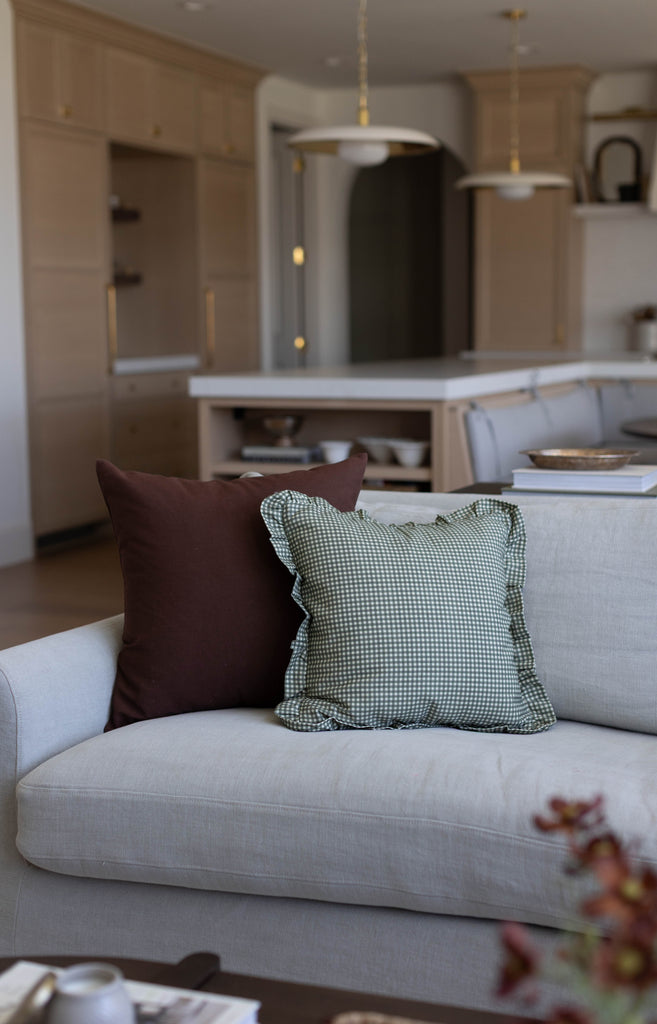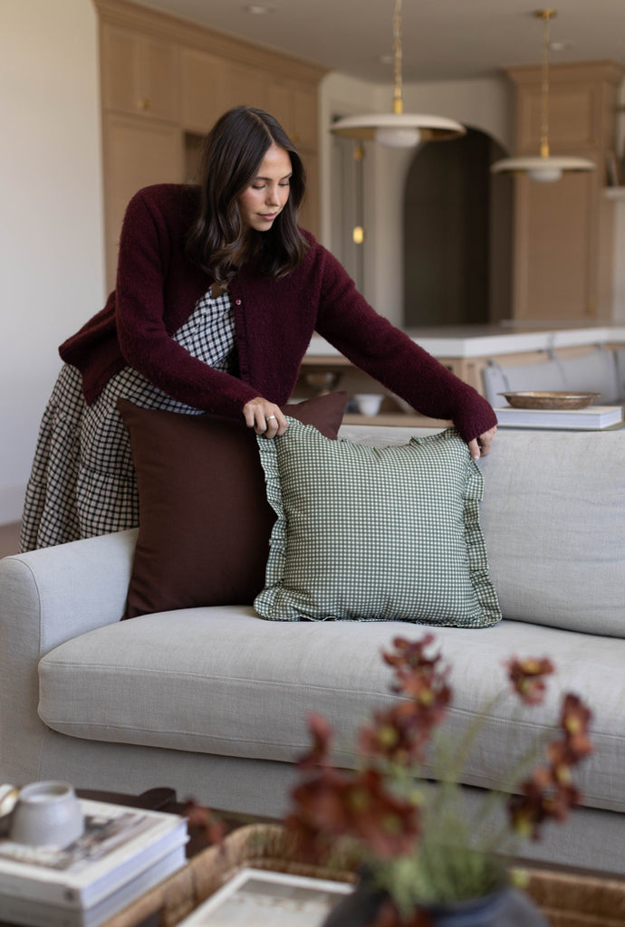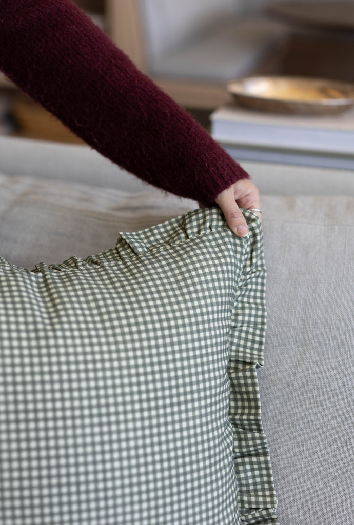 The green mini gingham ruffle brings a cozy, timeless feel with its classic green check pattern and soft ruffled edge. Perfect for layering with florals, stripes, or solids, it adds an inviting cottage-inspired touch to your sofa, bed, or favorite chair.